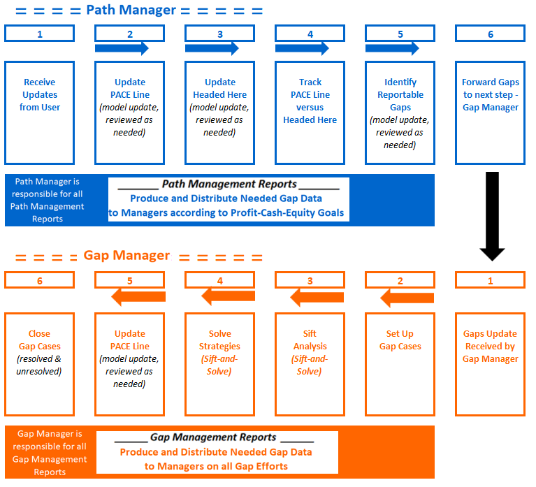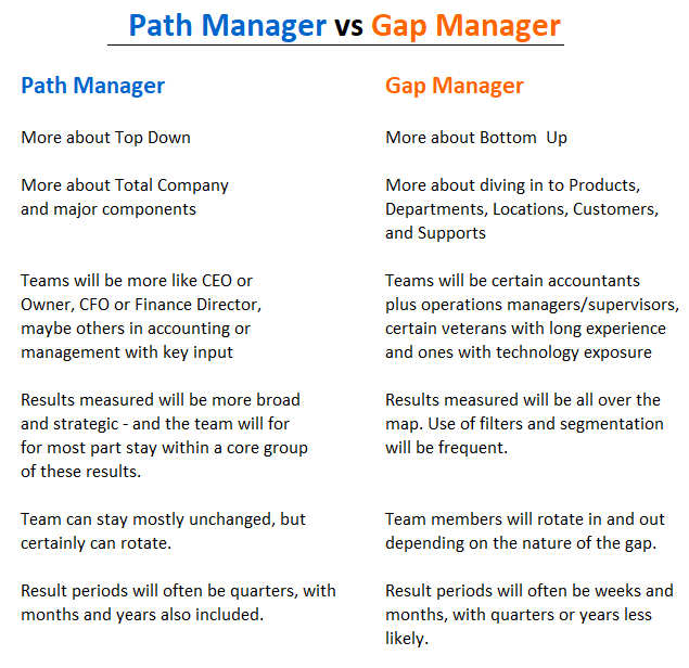 The Top Down tool is called Path-Line. The Bottom Up tool is called Gap-Line. In both cases the reporting views present results over selected time periods. These periods can be historical or forward or both in any given view. The content of any view will be a set of results - a statement, a list, etc. on a selected topic.