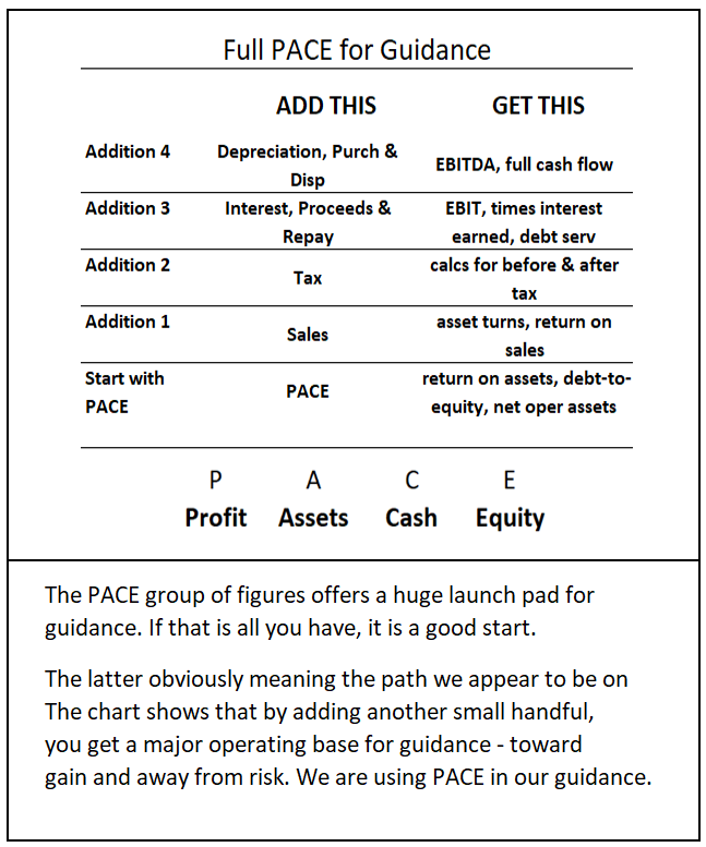 PACE stands for Profit, Assets, Cash and Equity, The PACE Charter is a combination of factors that guide at the top and fan out to expand that guidance.