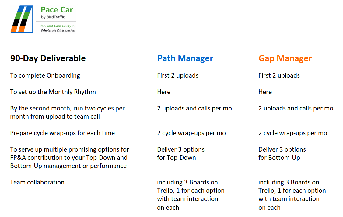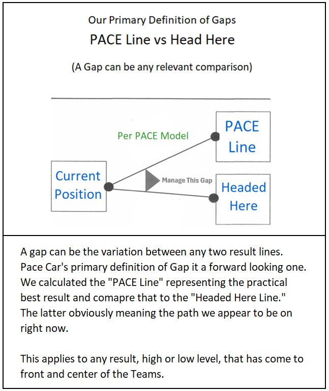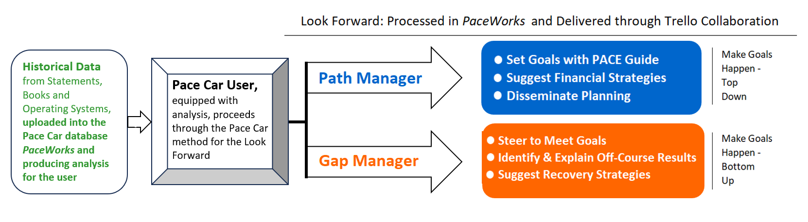 The Pace Car user runs a joint operation between Path Manager - which on the one hand sets and disseminates the path components going forward - and on the other deploys Gap Manager - which stays the course by scooping up the gaps seen in forward operating results and suggesting responses.