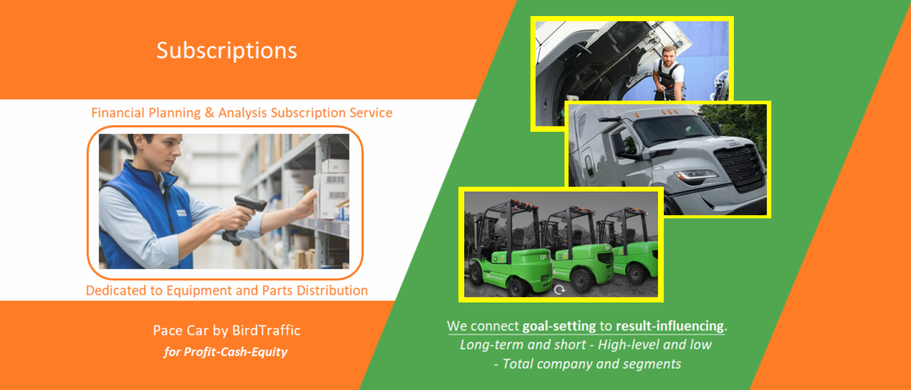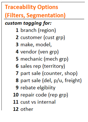 Depending on available imports, allows for analysis of segmented profit and loss results by (1) customer (or customer class) or (2) what the customer bought (part or repair, part or repair class, make, or model, make or model class, or (3) where or how the purchase was made (branch or branch class, vendor or vendor class, off truck or truck class, from mechanic, or mechanic class.